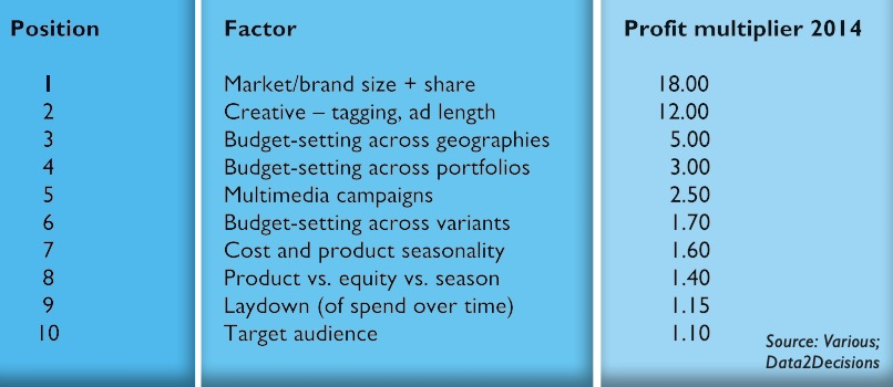 Größere Budgets führen dazu, dass sich große Marken bessere Agenturen und Dienstleister leisten können. Von data2decisions klar mit einem weiteren Profit Verstärker identifiziert: so fahren bessere Kreativ Exekutionen 12x mehr Profit ein - dies ist der zweitstärkste Effektivitäts Treiber.