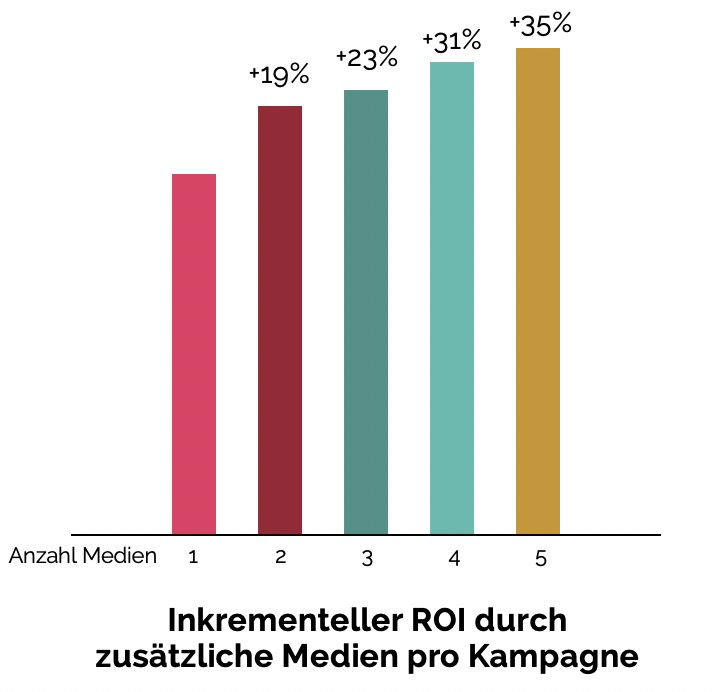 Große Budgets werden, um eine effiziente Verteilung zu gewährleisten und nicht im Overspend zu landen, auf mehr unterschiedliche Medien und Kanäle aufgeteilt. Und eben diese Verteilung erhöht nicht nur die Effizienz, sondern auch die Effektivität. Denn durch die Hinzunahme von Kanälen in einer Kampagne kann man Synergieeffekte nutzen. Jeder weitere Kanal hilft dabei, mehr potentielle Kunden zu erreichen. Und wir wissen nicht nur seit How Brands Grow, dass dies ein massiver Erfolgstreiber ist. Dies sagt uns auch die Auswertung der Effie-Cases der letzten 50 Jahre: